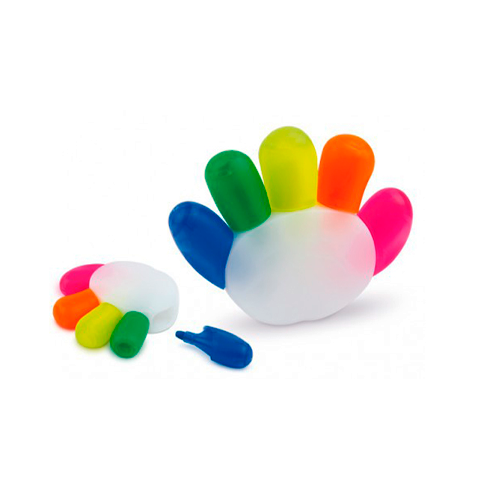 - Resaltador en forma de Mano, con 5 puntas. Colores Anaranjado, Verde, Amarillo, Turqueza y Rosado.