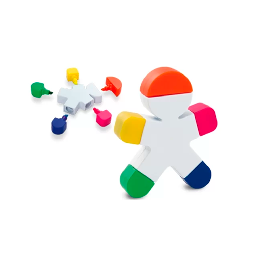 - Resaltador forma de muñeco, cinco puntas en color verde, fucsia, amarillo, anaranjado y celeste.