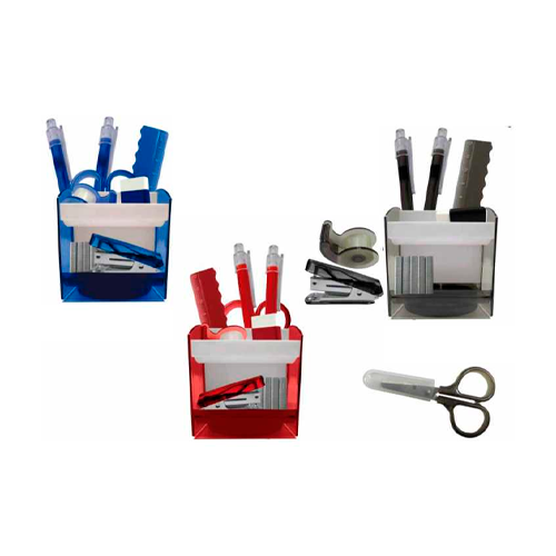 - Set de Escritorio de plástico giratorio, contiene: 1 engrapadora, grapas, 1 tijera con tapa,