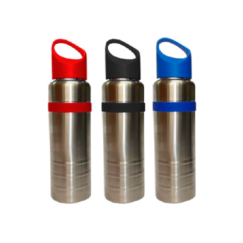 - Tomatodo totalmente metálico (interior y exterior) con aplicación de jebe de color en la parte superior y tapa, asa de plástico del mismo color de jebe. Capacidad: 700 ml.