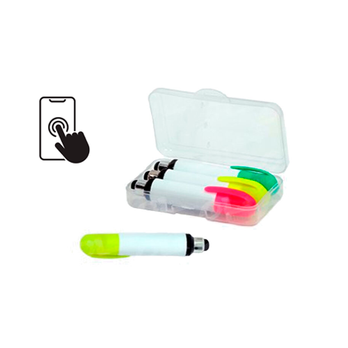• Estuche Transparente, contiene 3 resaltadores tipo crayola con touch en la parte superior. Resaltadores en color amarillo, verde y fuxia .
