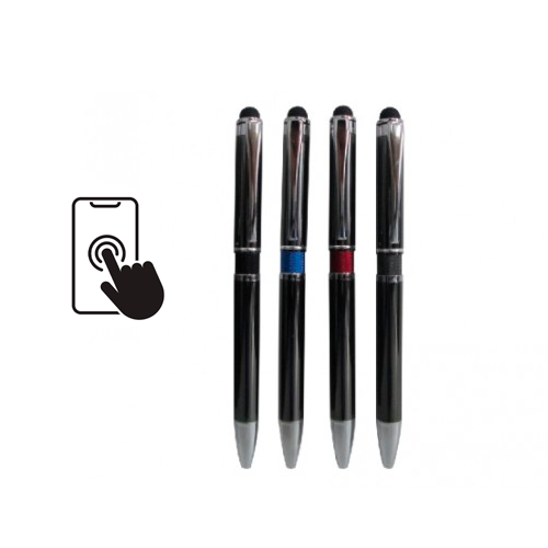 - Lapicero metálico de sistema retráctil, con punta touch en la parte superior para pantallas táctiles. (Tablets, celulares, etc). Color de tinta azul.