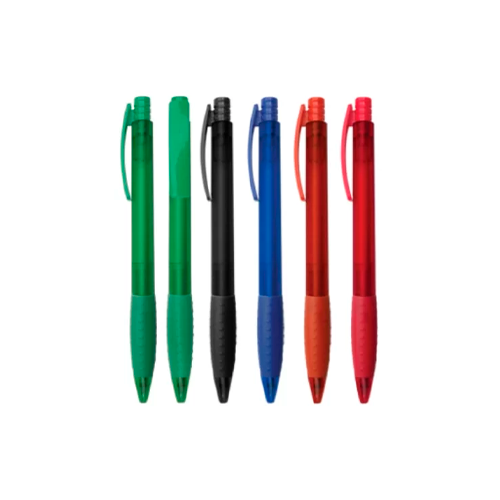 - Lapicero plástico retráctil de color traslúcido, con goma antideslizante en la base y clip de color sólido. Color de tinta azul.