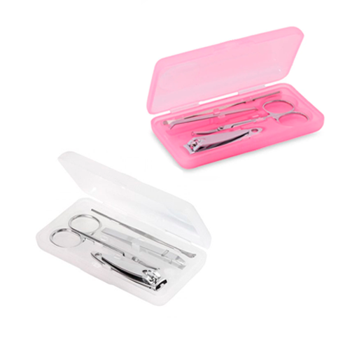 - Estuche plástico traslúcido que contiene: 1 pinza, 1 tijera, 1 corta uñas y 1 removedor de cutícula.
