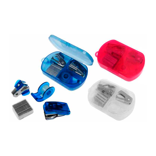 - Estuche de plástico transparente, incluye 1 engrapador, 1 saca grapas, grapas, 1 dispensador con cinta adhesiva.